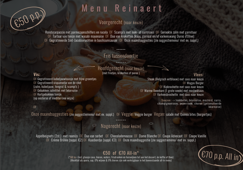 énkel het menu 'Reinaert' (Standaard of All-in) en het kindermenu 'Reinaert' (2 - 12 jaar) (A la carte bestellen is dan niet mogelijk)