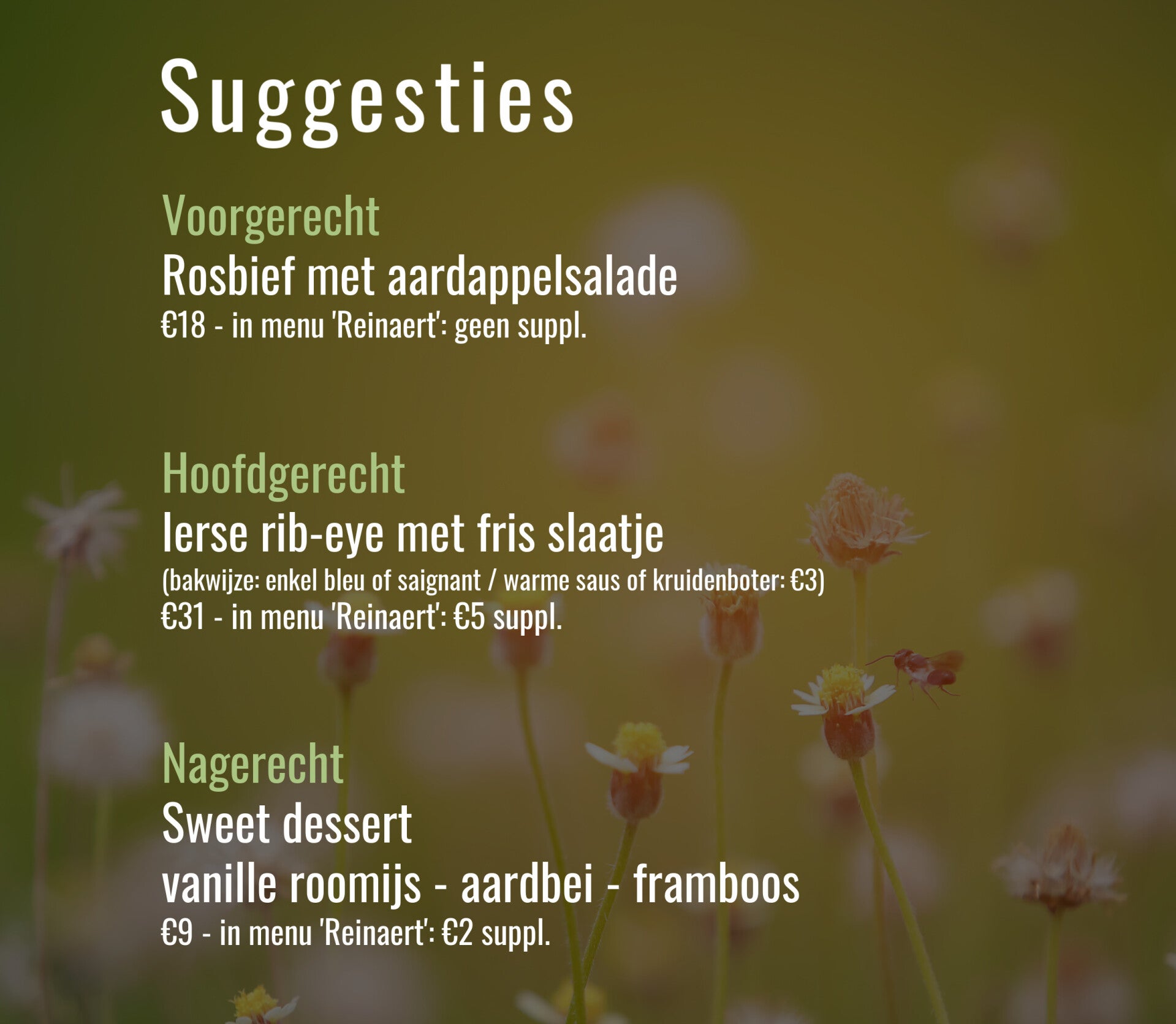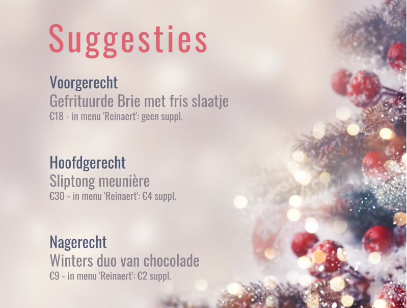 Onze maandelijks wisselende suggesties worden met zorg samengesteld en sluiten perfect aan bij de seizoenen. Zo geniet je optimaal van alles wat de natuur op dat moment te bieden heeft. Je kunt onze suggesties zowel 'à la carte' bestellen of als onderdeel van het menu 'Reinaert' (ev. mits supplement)